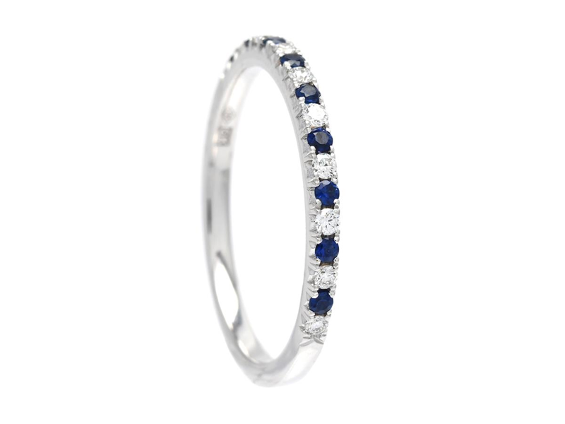 ETERNITY RING, 18K white gold, 9 round faceted blue sapphires approx. 0,13 ctw, 10 brilliant cut diamonds approx. 0,12 ctw, approx. W/SI, size 16,75 mm, weight 1,7 g, some diamond with small surface defects and notch on culet.