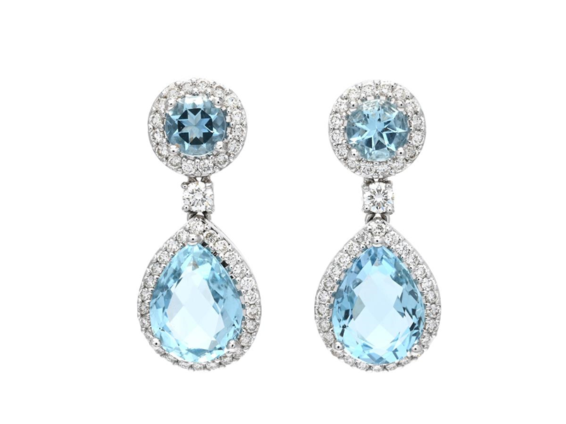 EARRINGS, 18K white gold, faceted aquamarines approx. 3,40 ctw, 86 brilliant cut diamonds approx. 0,56 ctw, approx. W-Cr/VS-SI, pushback, length 22,0 mm, weight 5,4 g, one aquamarine has scratch, some diamond has notch on culet.