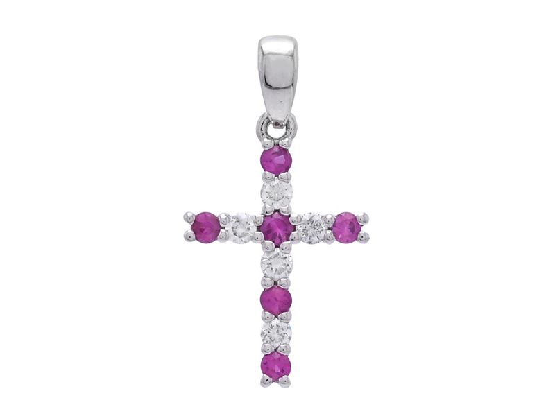 PENDANT, 18K white gold, cross, 6 round faceted rubies approx. 0,14 ctw, 5 brilliant cut diamonds approx. 0,09 ctw, approx. W/SI-P, height 13,0 mm, width 9,0 mm, weight 0,5 g.