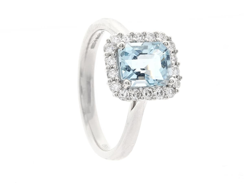 RING, platinum, octagonal faceted aquamarine approx. 1,34 ct, 18 brilliant cut diamonds approx. 0,31 ctw, approx. TW/SI, size 16,75 mm, weight 5,7 g.