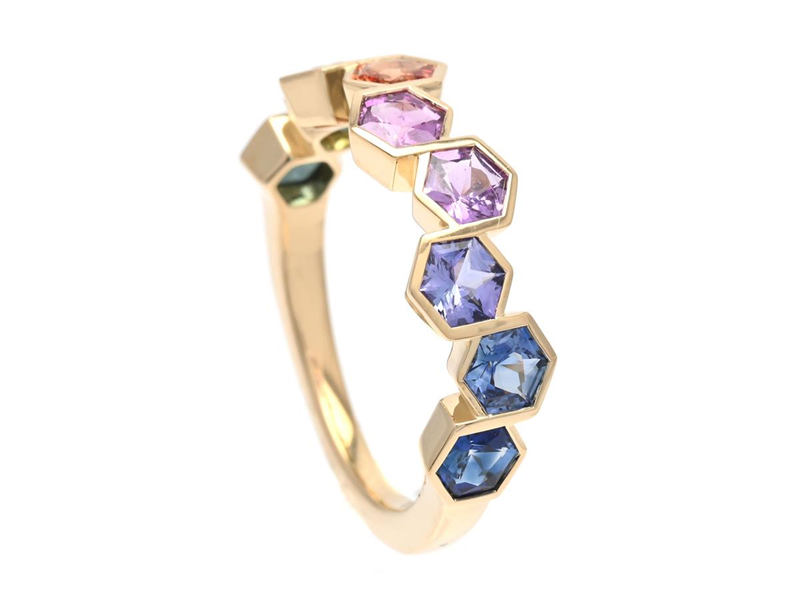 RING, 18K gold, 9 fantasy cut different colours sapphires approx. 2,06 ctw, size 16,75+ mm, weight 3,9 g.
