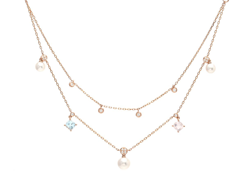 NECKLACE, 18K rose gold, cultured pearls, rose quartz approx. 0,43 ct, blue topaz approx. 0,55 ctw, 18 brilliant cut diamonds approx. 0,18 ctw, approx. TW/VS, length 42/45 cm, weight 4,9 g.