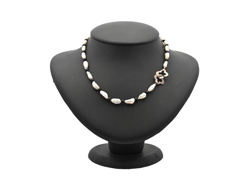 PEARL NECKLACE, cultured freshwater pearls, faceted onyx, clasp i sterling silver, length 38 cm.