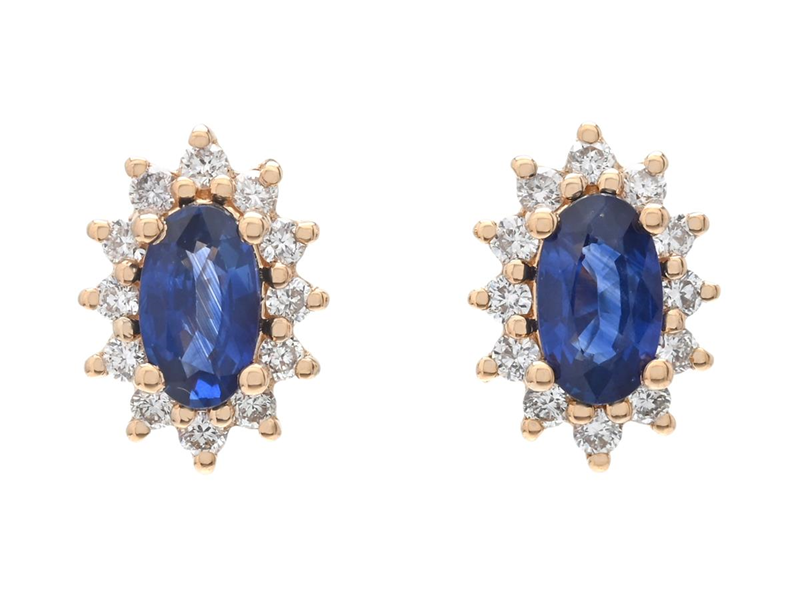 CLUSTER-EARRINGS, 18K gold, oval faceted blue sapphires 0,55 ctw, 24 brilliant cut diamonds 0,18 ctw, approx. TW-W/VS, pushback, measurements 8,5 x 6,0 mm, weight 2,1 g.