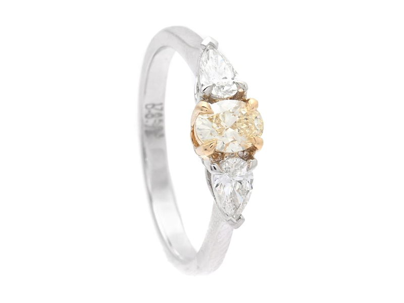 RING, 18K white gold/gold, oval-cut diamond approx. 0,38 ct, approx. LY/VVS, 2 pear shaped diamonds approx. 0,37 ctw, approx. W/SI, size 17 mm, weight 2,9 g.