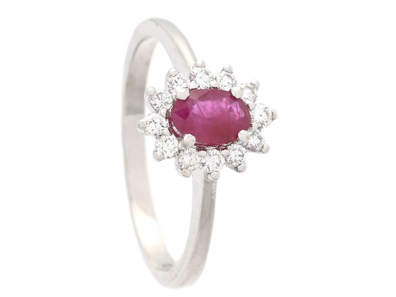 CLUSTER RING, 18K white gold, oval faceted ruby approx. 0,63 ct, 12 brilliant cut diamonds approx. 0,21 ctw, approx. W/SI, size 17,25 mm, weight 2,6 g.