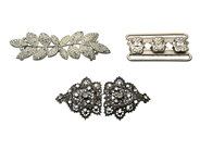 BELT CLASPS, 3 items, paste and white metal, width 105,0 / 88,0 / 38,0 mm, some stones missing.