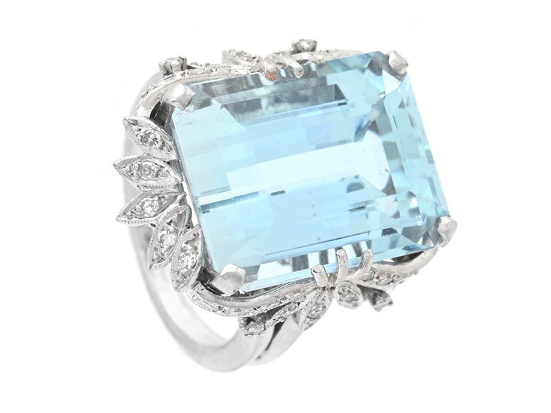 RING, platinum, emerald cut aquamarine approx. 18,5 ct, 36 single cut diamonds approx. 0,48 ctw, size 16,75 mm, weight 16,2 g.