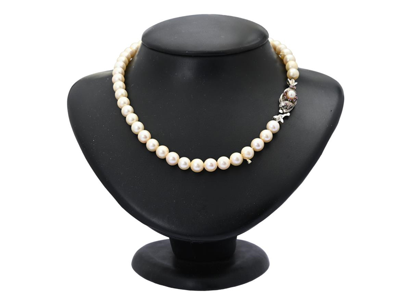 PEARL NECKLACE, cultured pearls approx. 7,5-8 mm, length 39 cm, clasp in 18K white gold, rubies, weight 33,7 g, unknotted, fragile silk.