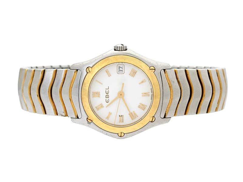 EBEL, Classic Wave, Lady, Serial no. 56605136, Case no. 1087F21, ladies´ wristwatch, 26,5 mm, steel/gold, quartz, sapphire crystal (repor/nagg), date, integrated original bracelet, folding clasp, approx. 2003.