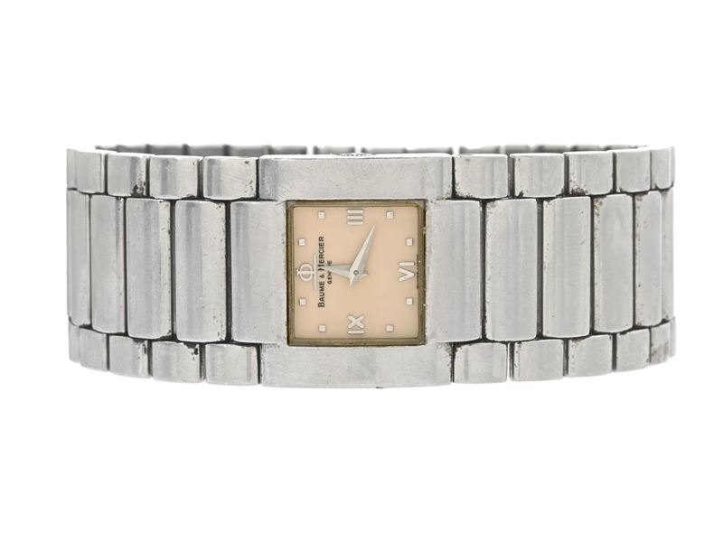 BAUME & MERCIER, Geneve, Catwalk, Cal 5057, Serial no. 2954412, Case no. MV045197, ladies´ wristwatch, 24 x 26 (32) mm, steel, quartz, sapphire crystal, damaged dial, integrated original bracelet, folding clasp, certificate, December 1997, box (not complete).