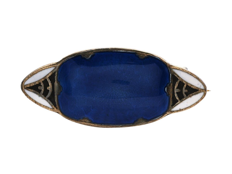 BROOCH, sterling silver, blue, black and white enamel, measurements approx. 13 x 30 mm, weight 3,9 g, pin in yellow metal.