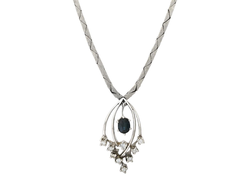 NECKLACE, 14K white gold, oval-cut sapphire, 9 brilliant cut diamonds 0,27 ctw according to engraving, approx. TW-W/SI, length approx. 42 cm, weight 21,1 g.