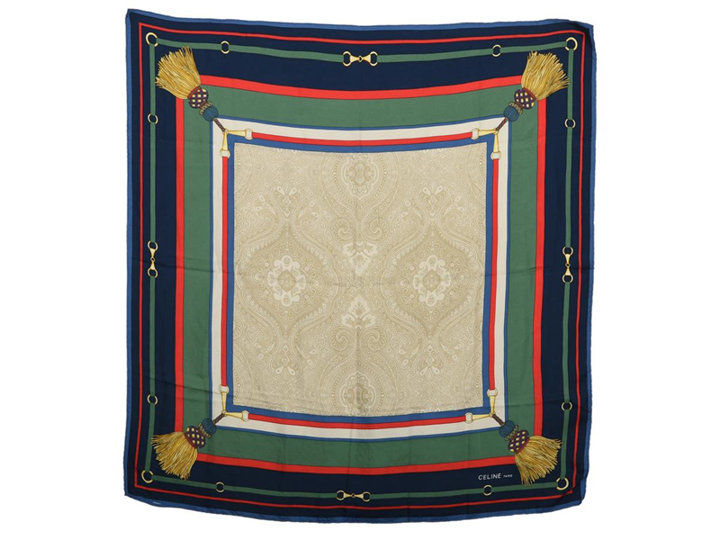 SCARF, CELINE, 100% silk, 84x86 cm, blue, red, green, pulled threads.
