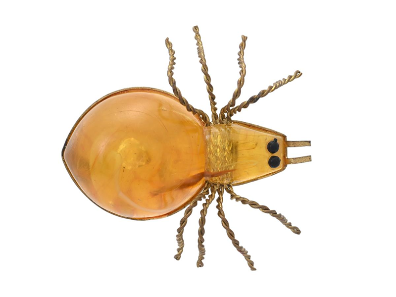 BROOCH, yellow metal, plastic, spider, length 5 cm, width 4,8 cm, weight 11,1 g.