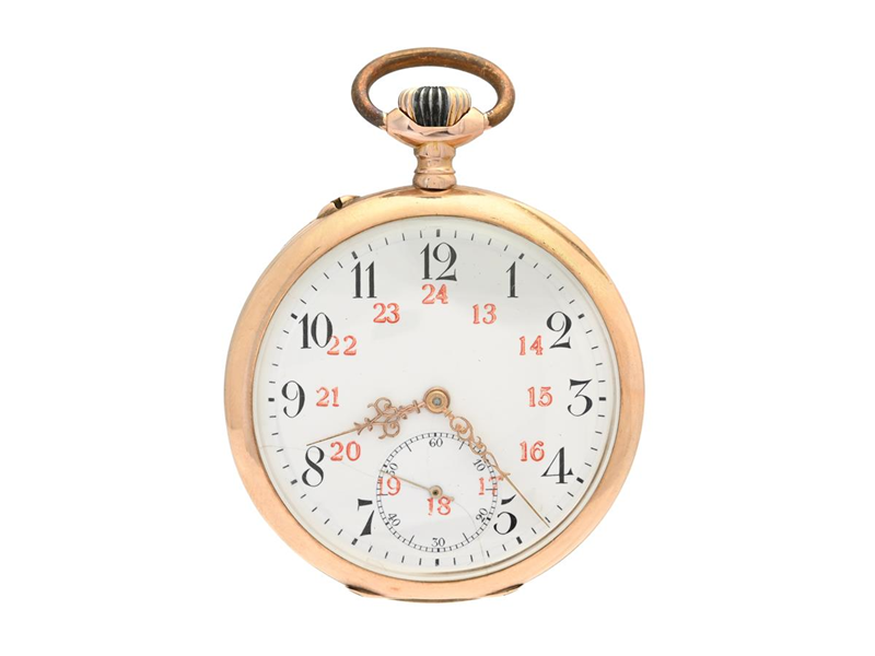 IWC, pocket watch, 49 mm, Cal 52 (H6 1/2), Serial no. 383004, Case no. 402510, 14K gold, lever escapement, dial not signed, damaged dial, monogram, dents, approx. 1907, case (Robert Engström Urmakare, Hangatan 20 Sthlm).
