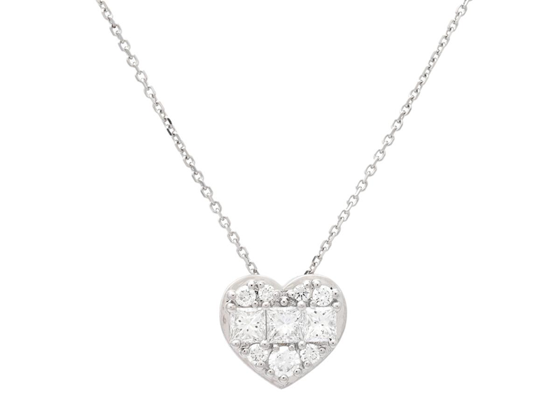 PENDANT/CHAIN, heart, 18K white gold with 3 princess cut diamonds 0,57 ctw, 7 brilliant cut diamonds 0,23 ctw, approx. TW(G)/VS, length 43-45 cm, weight 3,3 g