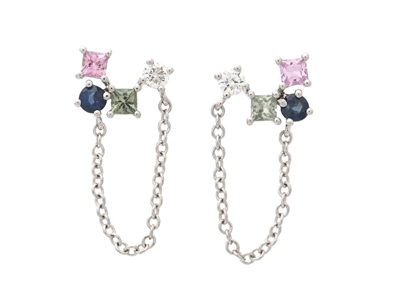 EARRINGS, 18K white gold, 2 brilliant cut diamonds 0,09 ctw, approx. TCr/P, square and round faceted sapphires 0,47 ctw, pushback, length 17,0 mm, weight 1,3 g.