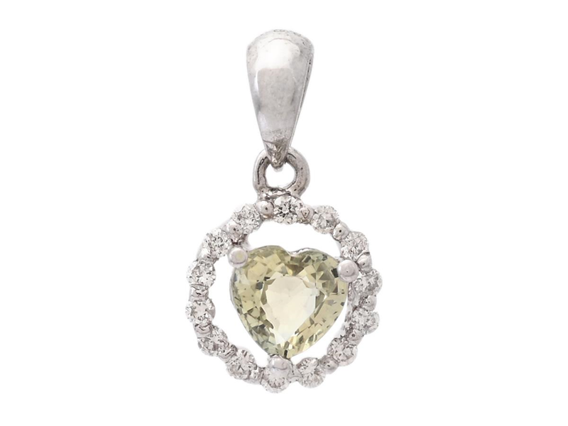 PENDANT, 18K white gold, heart-shaped faceted yellow-green sapphire 0,35 ct, 14 brilliant cut diamonds 0,08 ctw, approx. W-Cr/SI-P, measurements 7,0 mm, weight 0,5 g, some stones with surface defects.