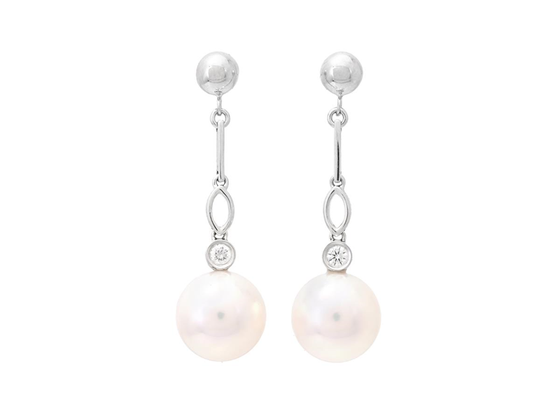 PEARL EARRINGS, 18K white gold, cultured pearls approx. 8,2 mm, 2 brilliant cut diamonds 0,05 ctw, approx. W/VS, pushback, length 27,0 mm, weight 3,1 g.