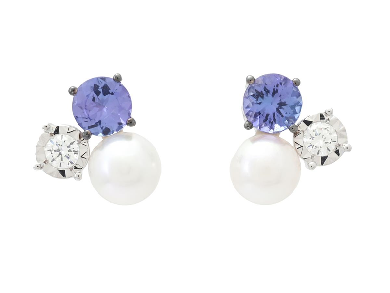 PEARL EARRINGS, 18K white gold, cultured pearls approx. 6,0 mm, round faceted tanzanites 0,94 ctw, 2 brilliant cut diamonds 0,17 ctw, approx. TW/VS-SI, pushback, measurements 11,0 x 10,0 mm, weight 2,7 g.