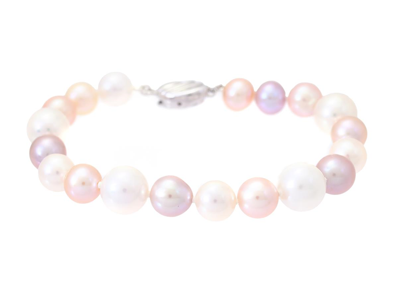 PEARL BRACELET, cultured freshwater pearls approx. 7,5-9,5 mm, pink and white tones, knotted, clasp i silver and white metal, length 18 cm, weight 15,9 g.