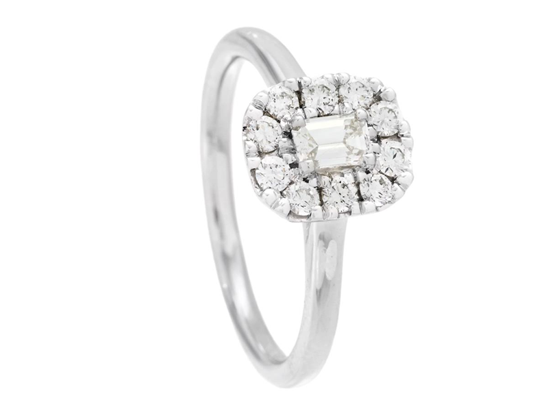 RING, 18K white gold, emerald cut diamond 0,17 ct, 10 brilliant cut diamonds 0,23 ctw, approx. TW/VS, size 16 mm, weight 3,5 g.