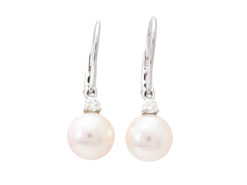 PEARL EARRINGS, 18K white gold, cultured pearls approx. 7,4 mm, 2 brilliant cut diamonds approx. 0,10 ctw, approx. TW/VS, closeable hooks, length 23,0 mm, weight 2,4 g.