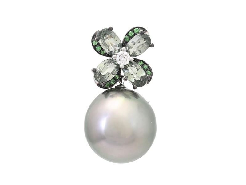 PEARL PENDANT, 18K white gold, partly blackened, Tahitian pearl approx. 12,0 mm, oval faceted green sapphires 1,32 ctw, brilliant cut diamond 0,05 ct, approx. TW/SI, 12 tsavorites 0,05 ctw, height 22,0 mm, weight 3,9 g.