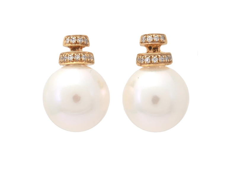 PEARL EARRINGS, 18K gold, cultured pearls approx. 8,0 mm, 22 brilliant cut diamonds 0,04 ctw, approx. W/SI, pushback, height 12,0 mm, weight 2,8 g.