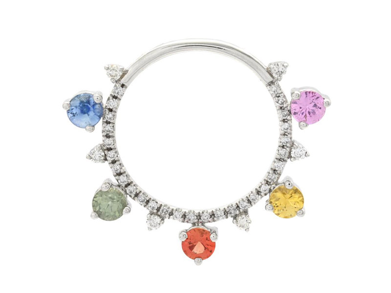 PENDANT, 18K white gold, 5 round faceted different colours sapphires 0,87 ctw, 34 brilliant cut diamonds 0,18 ctw, approx. W-Cr/SI-P, height 21,0 mm, weight 2,3 g.