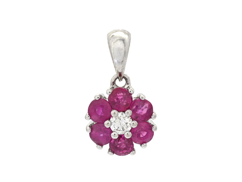 PENDANT, 18K white gold, 6 round faceted rubies 0,56 ctw, brilliant cut diamond 0,04 ctw, approx. W/SI, height 7,0 mm, weight 0,8 g.