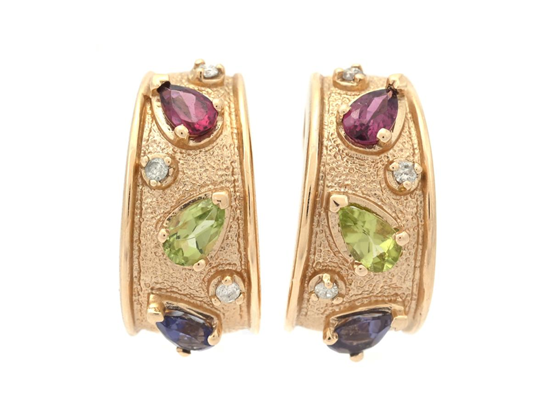 EARRINGS, 14K gold, pear shaped tanzanites, peridots and tourmalines, 6 brilliant cut diamonds, approx. 0,06 ctw, approx. W/P, pushback with clips, weight 7,2 g.
