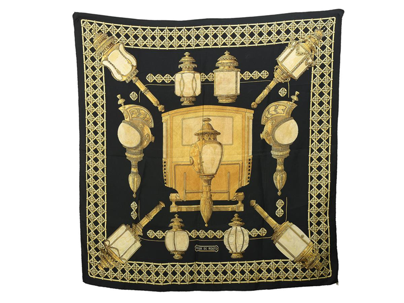 SCARF, HERMÈS, Feux de Route, Caty Latham, 100% silk, 88x90 cm, black, yellow, stains.