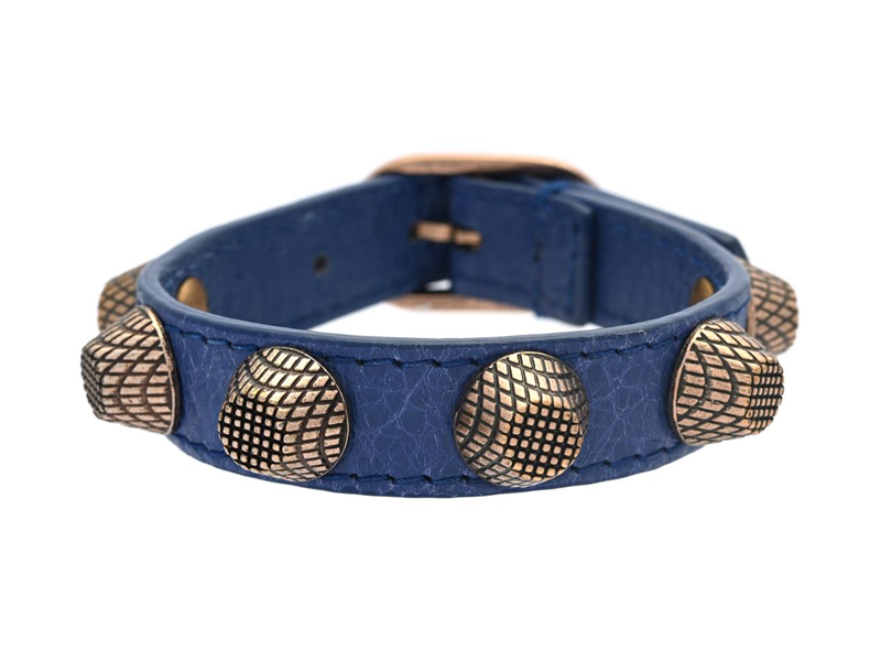 BRACELET, BALENCIAGA, blue leather, brass-coloured studs, 16-20 cm, case, signs of wear.