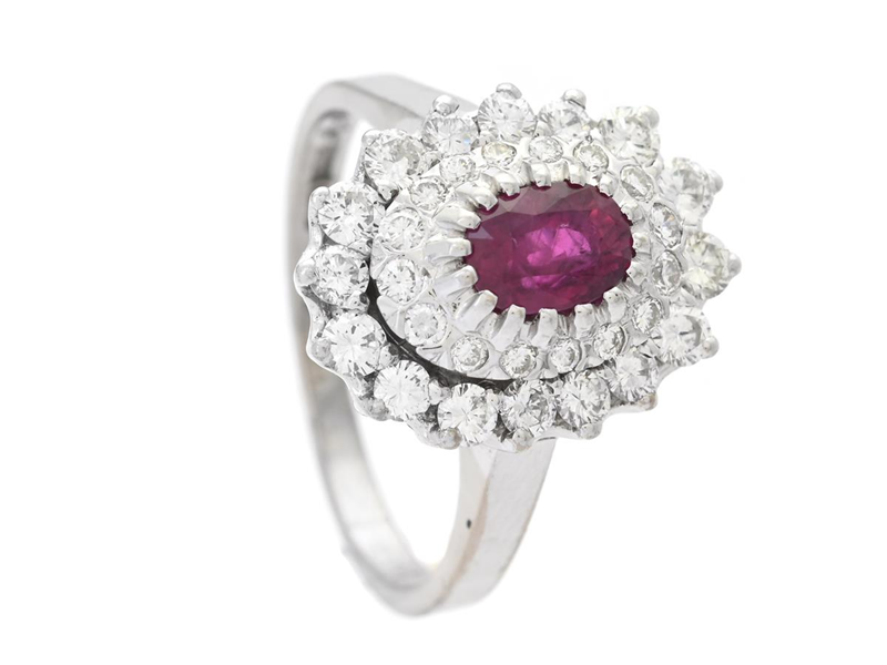 CLUSTER RING, 18K white gold, oval-cut ruby 0,91 ct, 32 brilliant cut diamonds approx. 0,91 ctw, approx. TW-Cr/VVS-VS, Juvelateljén, Gothenburg 1984, size 18,25 mm, weight 6,7 g.