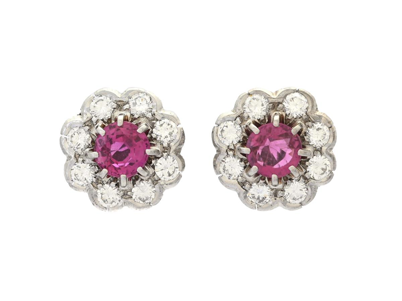 CLUSTER EARRINGS, 18K white gold, rubies, 16 brilliant cut diamonds approx. 0,50 ctw, approx. TW/VS, diameter 9 mm, weight 3,3 g, pushback, a few diamond has damages.