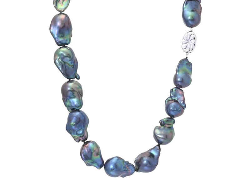 PEARL NECKLACE, dyed cultured freshwater pearls, baroque approx. 15,0 mm, clasp i silver and white metal, length 44 cm, weight approx. 108,0 g.