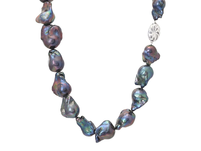 PEARL NECKLACE, dyed cultured freshwater pearls, baroque approx. 15,0 mm, clasp i silver and white metal, length 44 cm, weight approx. 108,0 g.