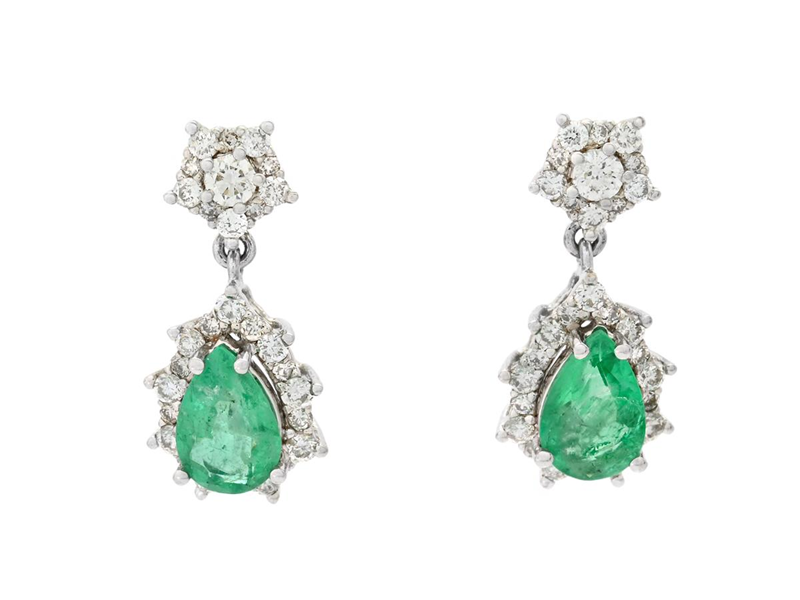 EARRINGS, 18K white gold, drop shaped faceted emeralds 0,74 ctw, 58 brilliant cut diamonds 0,37 ctw, approx. W-TCr/SI-P, pushback, length 14,0 mm, weight 2,1 g.