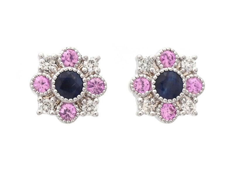 EARRINGS, 18K white gold, blue sapphires 0,45 ctw, 8 pink sapphires 0,52 ctw, 8 brilliant cut diamonds 0,14 ctw, approx. W-Cr/SI-P, pushback, measurements approx. 8,0 x 8,0 mm, weight 2,1 g.