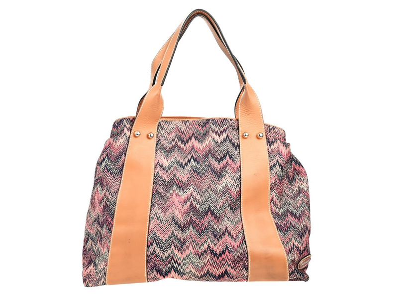 BAG, MISSONI, pink, blue, white fabric, brown leather, 40x 31x12 cm, signs of wear.