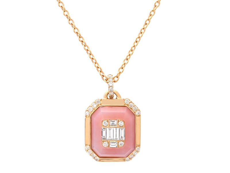 PENDANT/CHAIN, 18K gold with pink opal 2,23 ct, 6 baguette cut diamonds 0,18 ct TW(G)/VS, 26 brilliant cut diamonds 0,18 ctw, approx. TW(G)/VS-SI, length 40 cm, weight 7,4 g