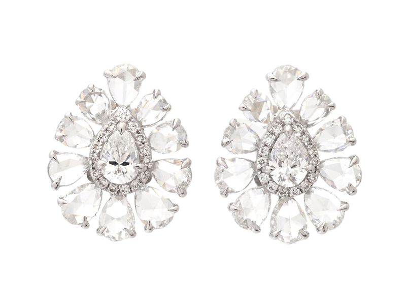 EARRINGS, 18K white gold with 2 items pear shaped diamonds 0,27 ctw, 30 brilliant cut diamonds 0,07 ctw, 20 drop shaped rose cut diamonds 1,09 ctw, approx. TW/VS-SI, pushback, weight 3,2 g