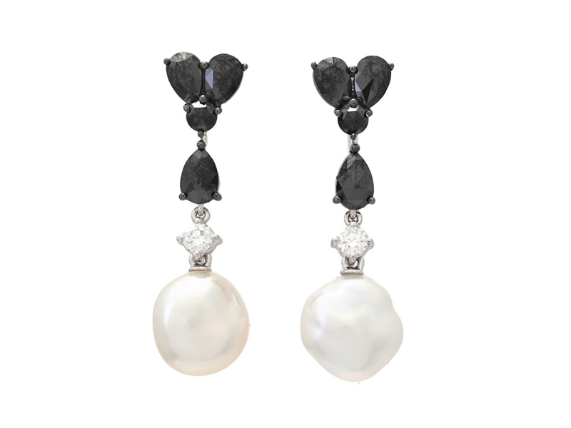 PEARL EARRINGS, 18K white gold, South Sea pearls (Keshi) approx. 8,0 mm, black diamonds 1,10 ctw, 2 brilliant cut diamonds 0,12 ctw, approx. TW-W/VS, pushback, length 26,0 mm, weight 3,4 g.