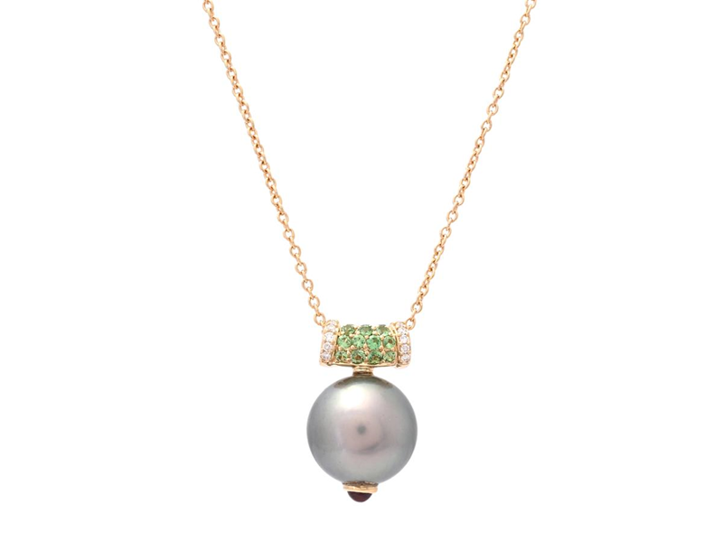 PENDANT WITH CHAIN, 18K gold with Tahitian pearl 12,1 mm, 16 brilliant cut diamonds 0,08, 17 tsavorites 0,29 ctw, pink tourmaline 0,12 ctw, , weight 6,1 g, length 40 cm