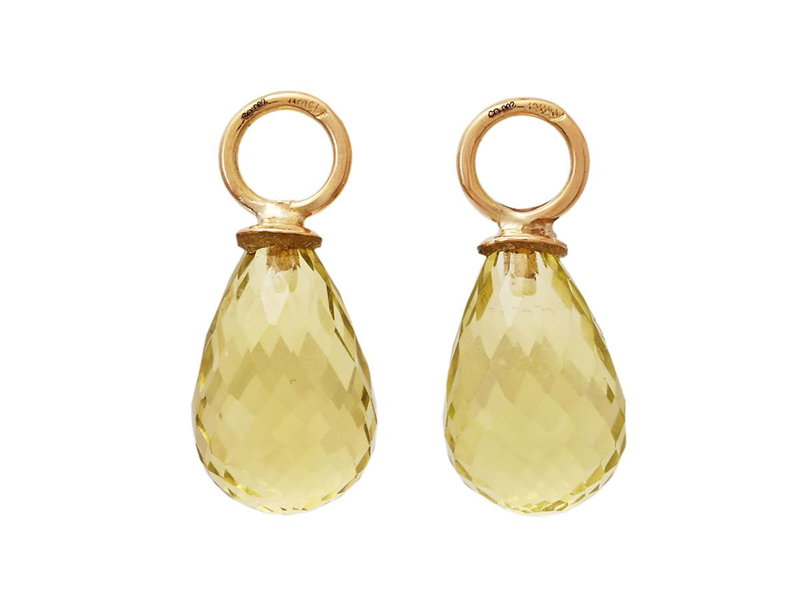 EARRINGS ATTACHMENTS, 2 items, 18K gold, briolett cut lime quartz approx. 12,0 x 8,0 mm, loop 4,0 mm, height 19,0 mm, weight 2,5 g.