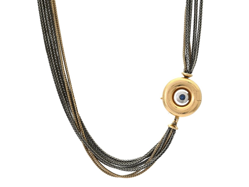 OLE LYNGGAARD, clasp, 18K gold/white gold, with brilliant cut diamond approx. 0,10 ct, sapphire, necklace, 6-rows, 14K gold/silver, length 41 cm, weight 42,6 g.