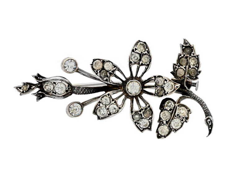BROOCH, silver, paste, flower with paper, length 6 cm, stones with notches, weight 15,3 g.