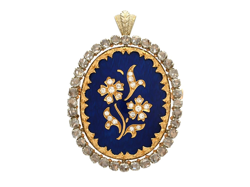 PENDANT/BROOCH, 18K gold, blue enamel, rose cut diamonds, height 40 mm, weight 15,6 g, some diamonds with notches.